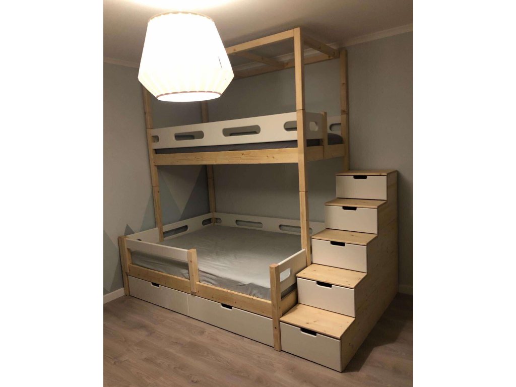 Bezpečnostní zábrany po obvodu obou postelí chrání děti během spánku a umožňují rodičům klidný odpočinek. Praktické schůdky s vestavěnými zásuvkami slouží nejen jako bezpečný přístup na horní lůžko, ale i jako chytré úložiště pro hračky, oblečení či ložní prádlo.